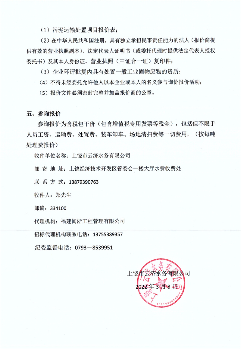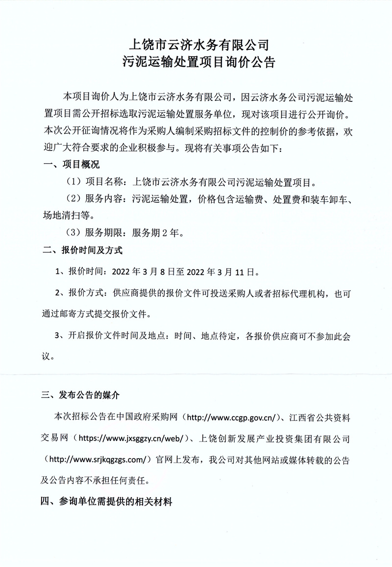上饒市云濟水務(wù)有限公司污泥運輸處置項目詢價公告